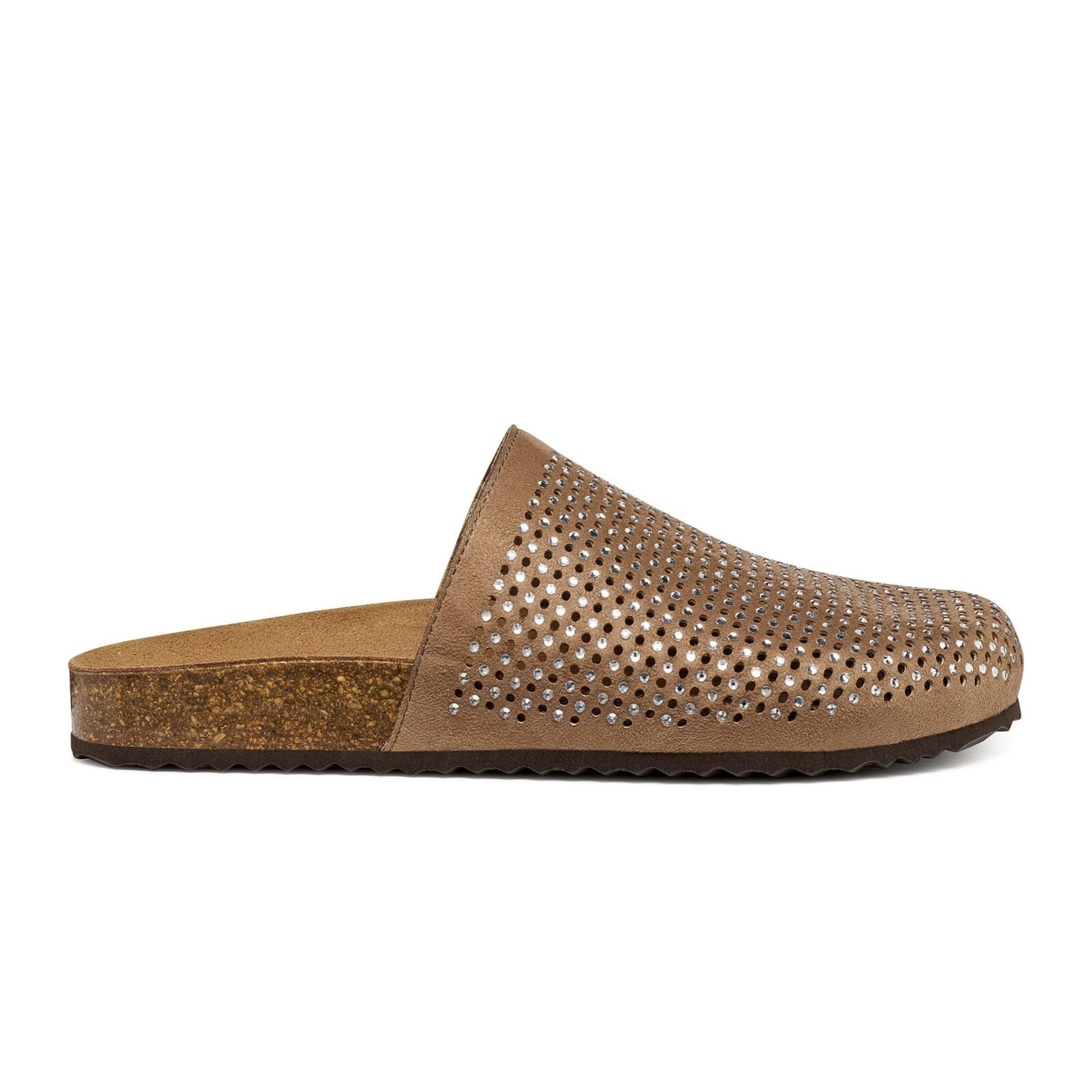 A soft, suede-look upper is enhanced by sparkling silver studs. The elegant old rose color and cork-effect sole create a modern look that’s perfect for any casual outfit.