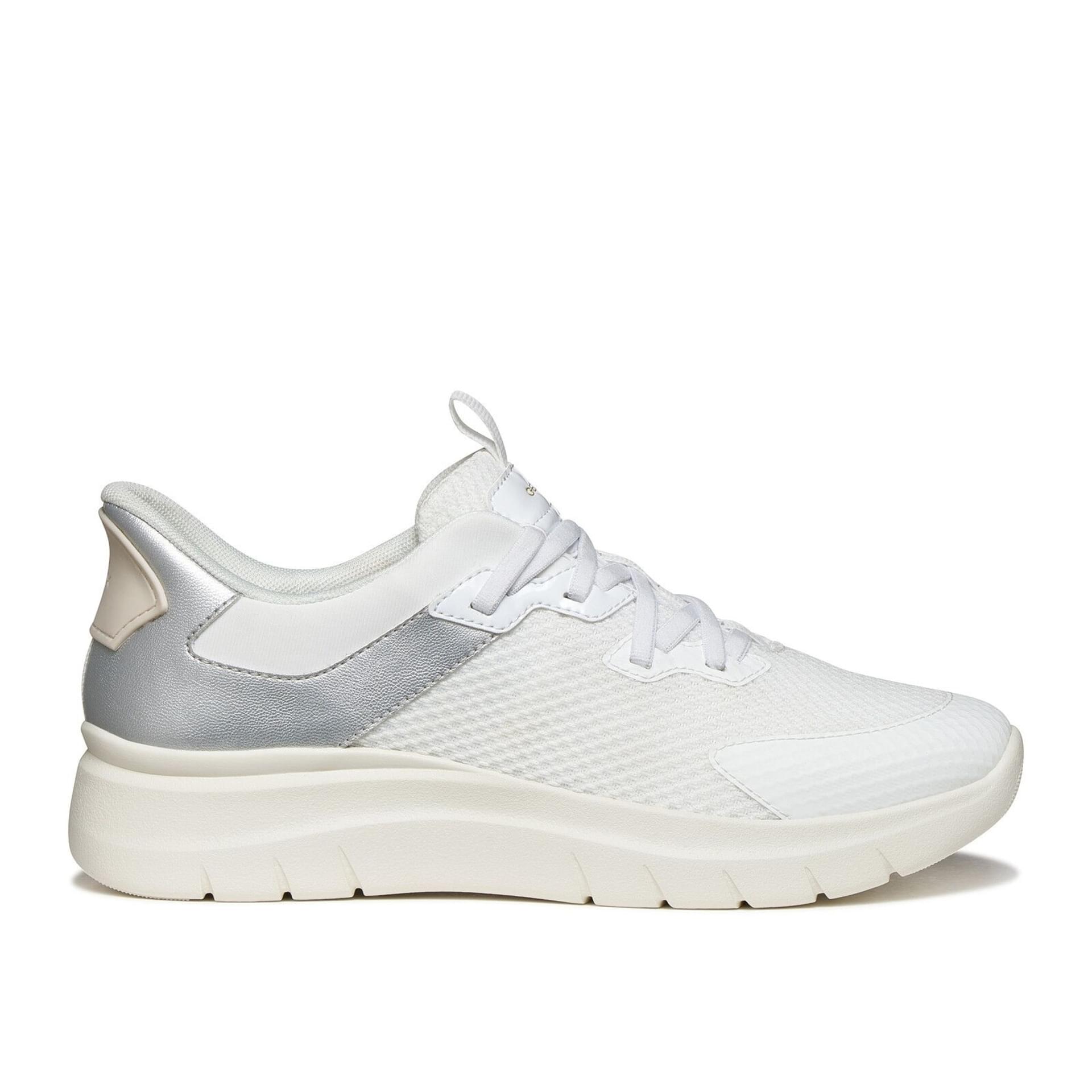 This Geox women’s sneaker features a fresh white look with subtle silver