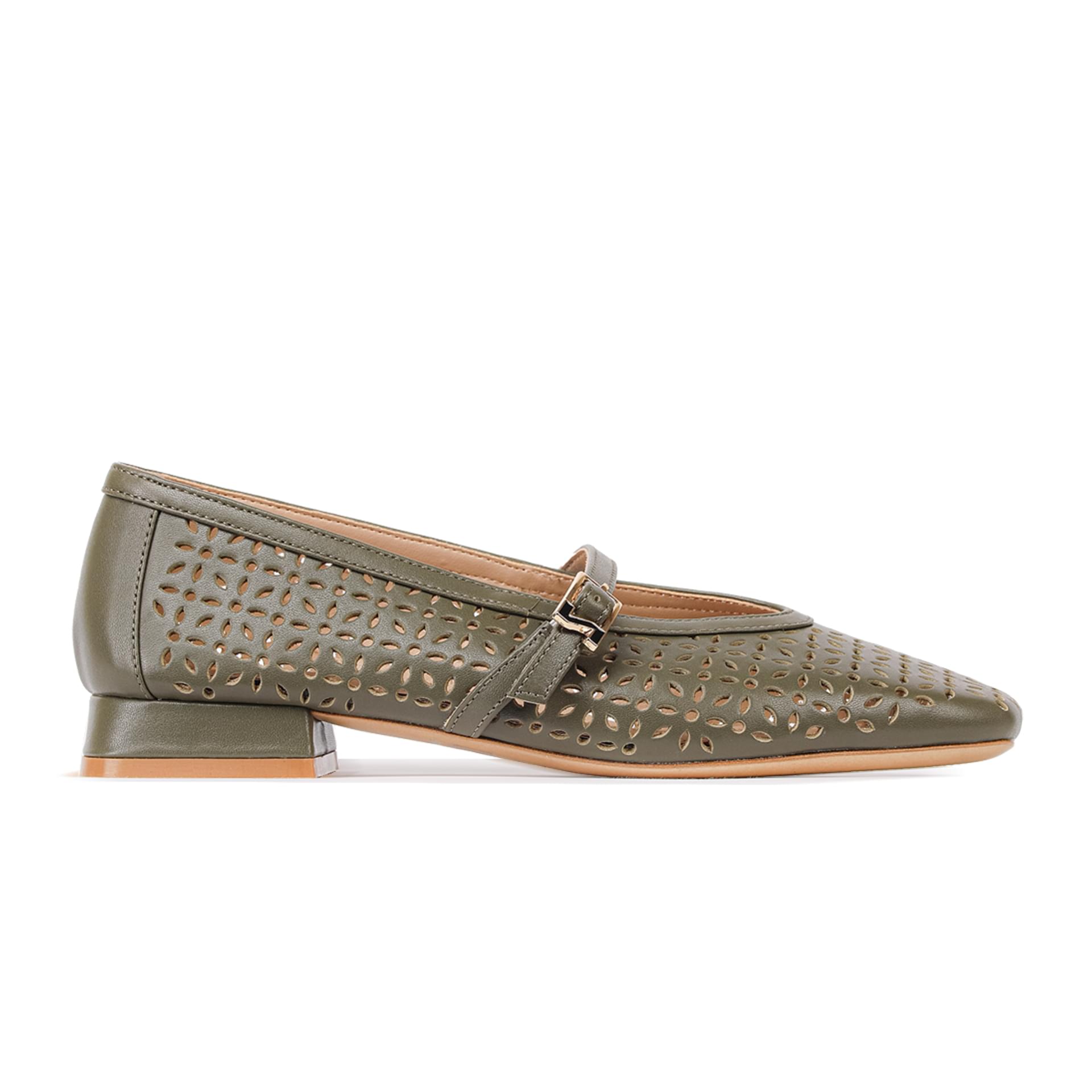 The adjustable buckle ensures a perfect fit, and the closed almond-shaped toe provides extra protection for your feet. The green leather with perforated floral pattern adds a unique and fresh touch that easily elevates any casual or office outfit.