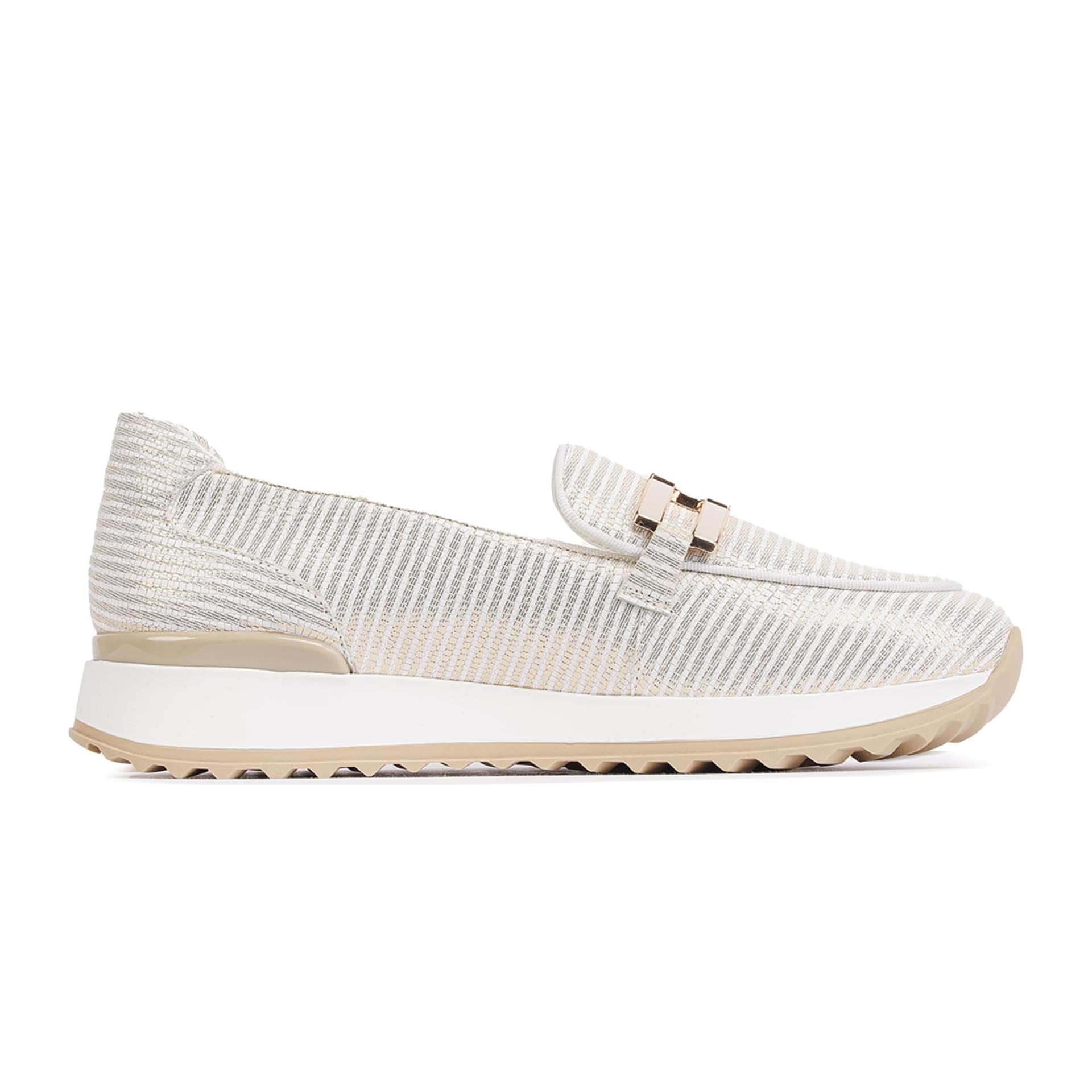 Refined accents, like the decorative metallic strap on the instep, complete the design. These moccasins blend modern elegance with comfort, making them ideal for active days or relaxed outings.