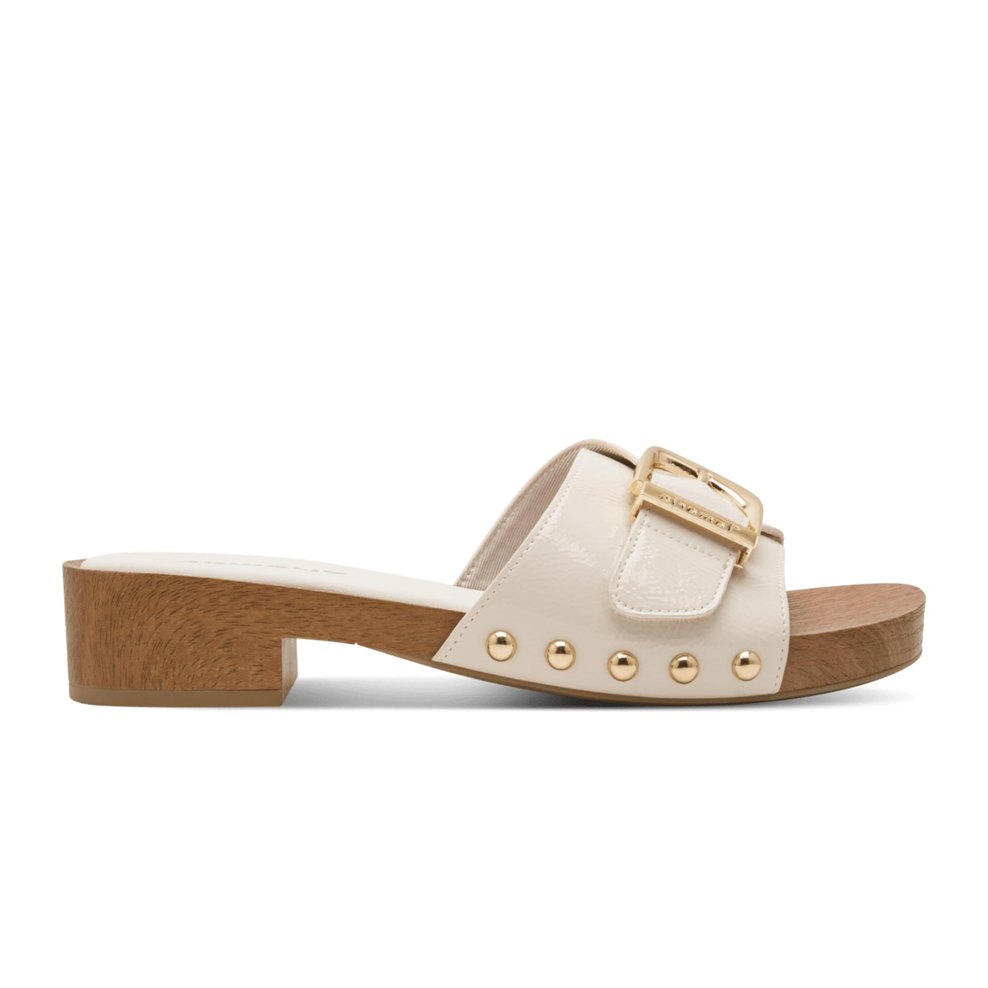 glossy upper and wide strap with gold buckle create a fresh, modern look that