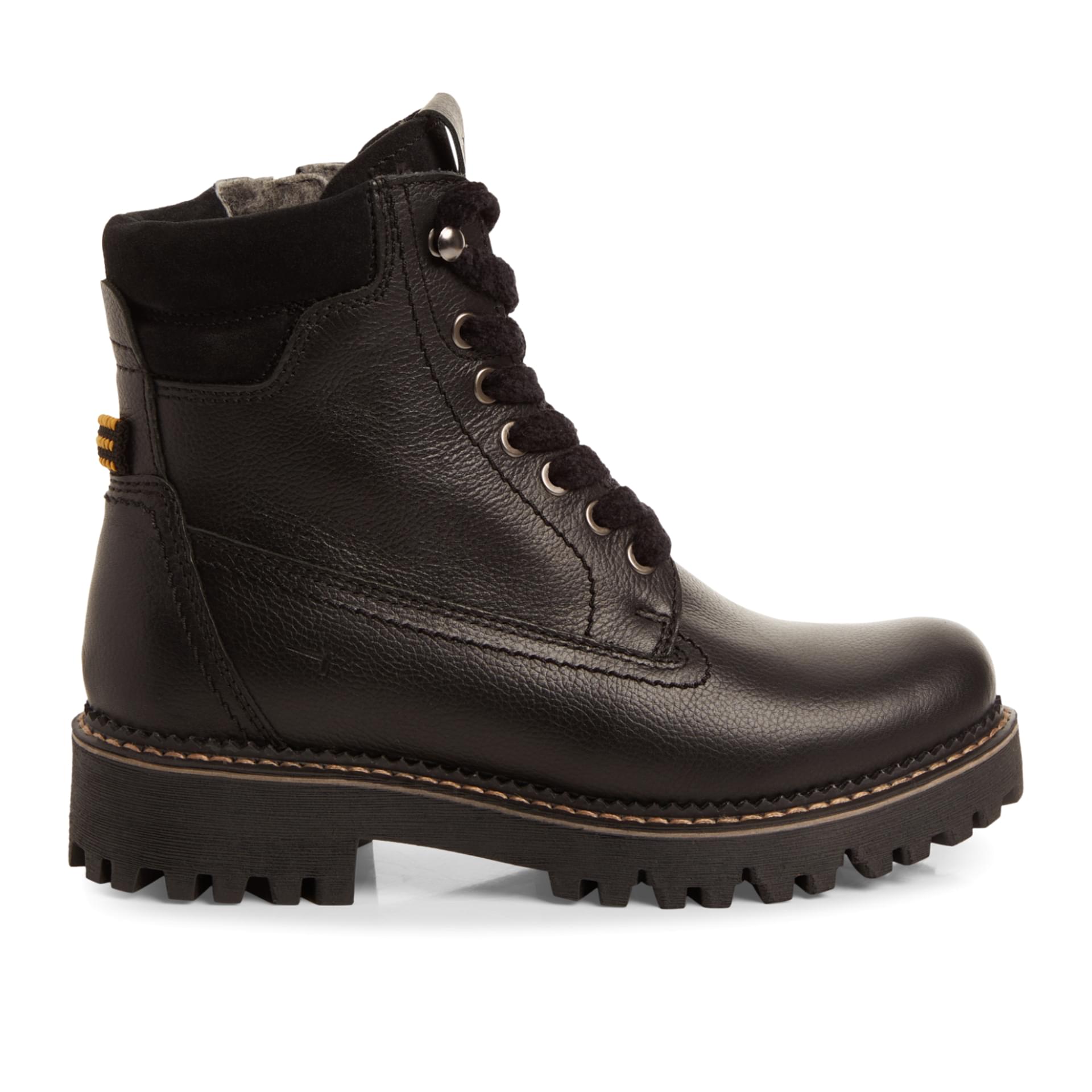 The black boot is made from high-quality leather, lined with warm wool, and