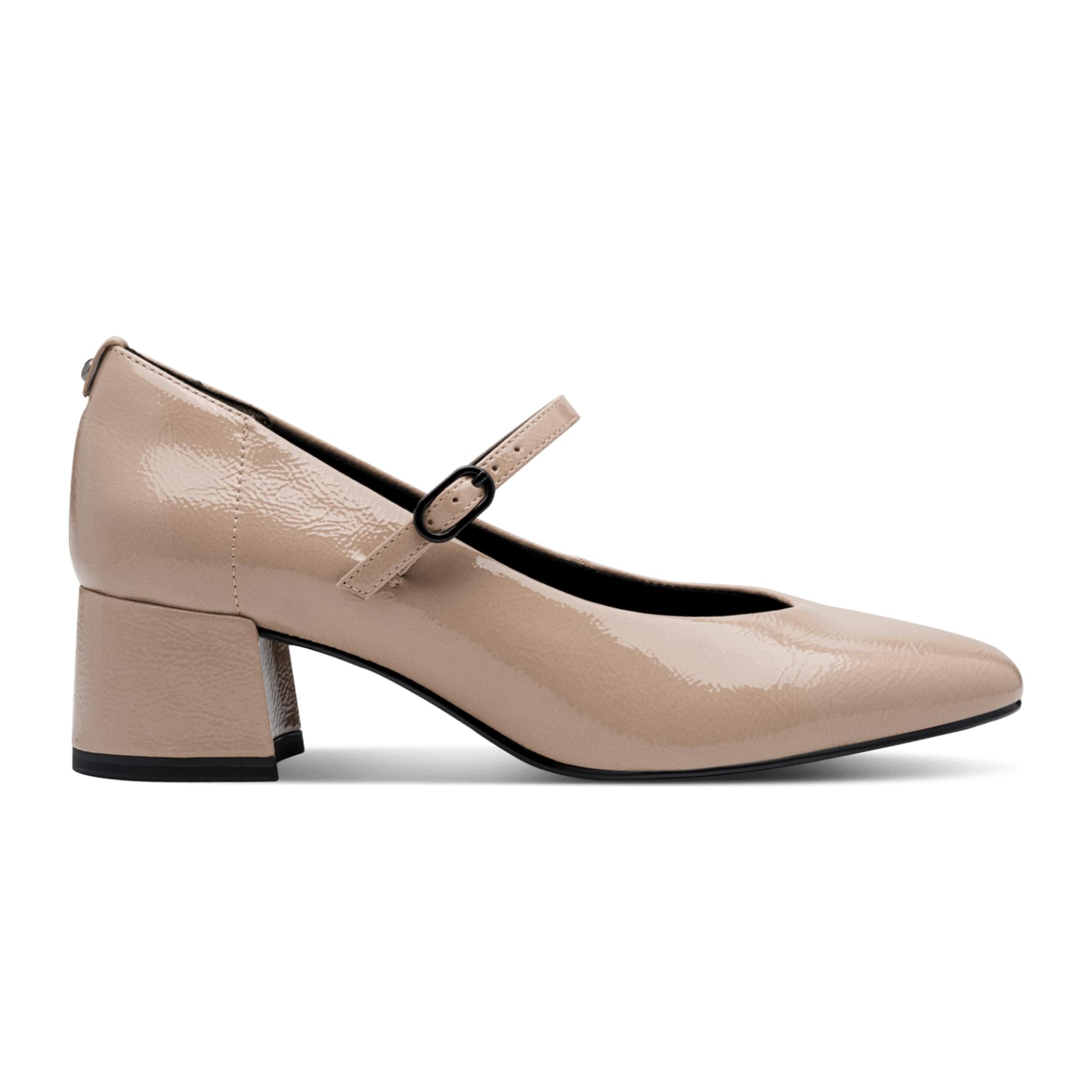 Discover these Tamaris Mary Jane heels. The subtle taupe color with a glossy