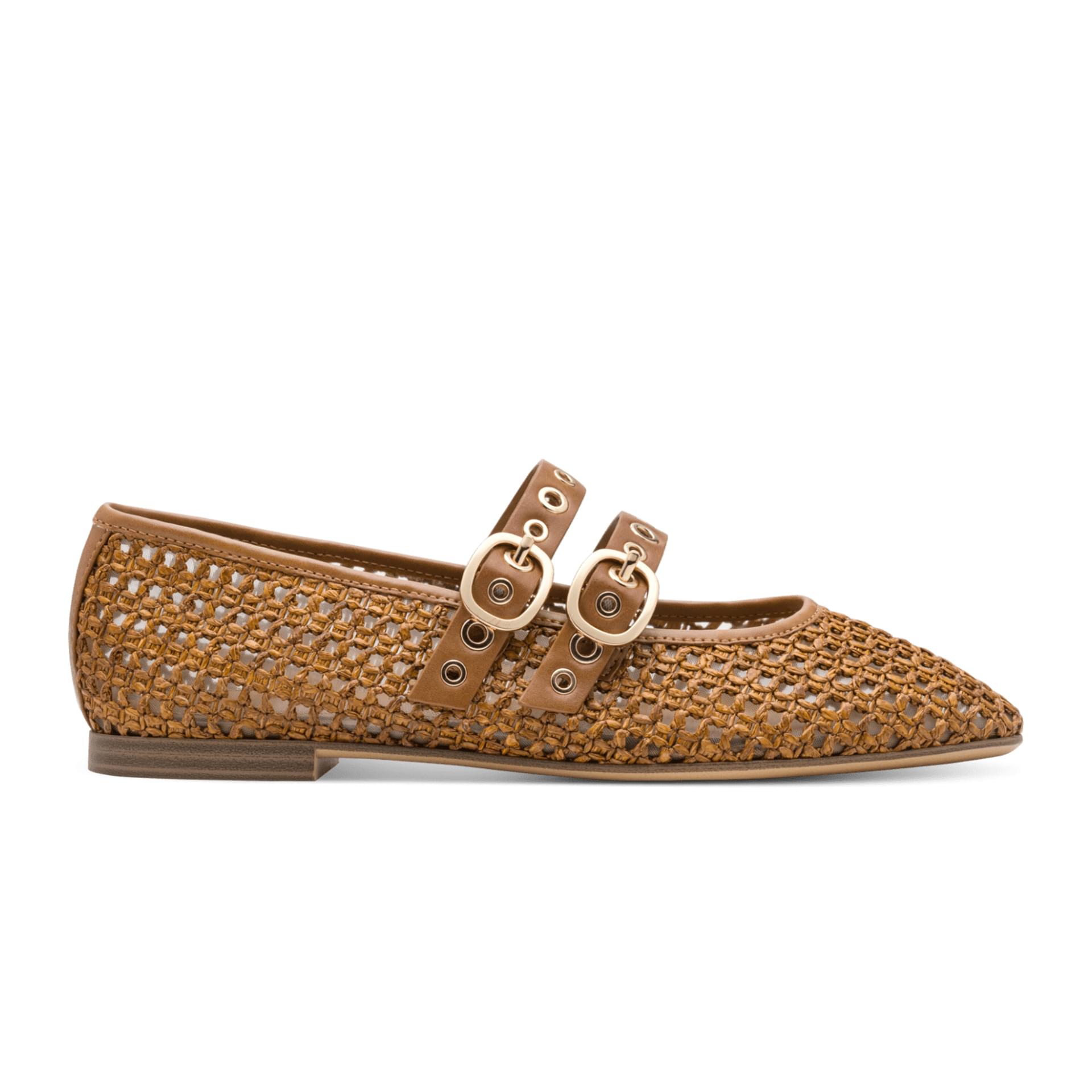 buckles creates an elegant yet playful look. The warm brown woven upper makes