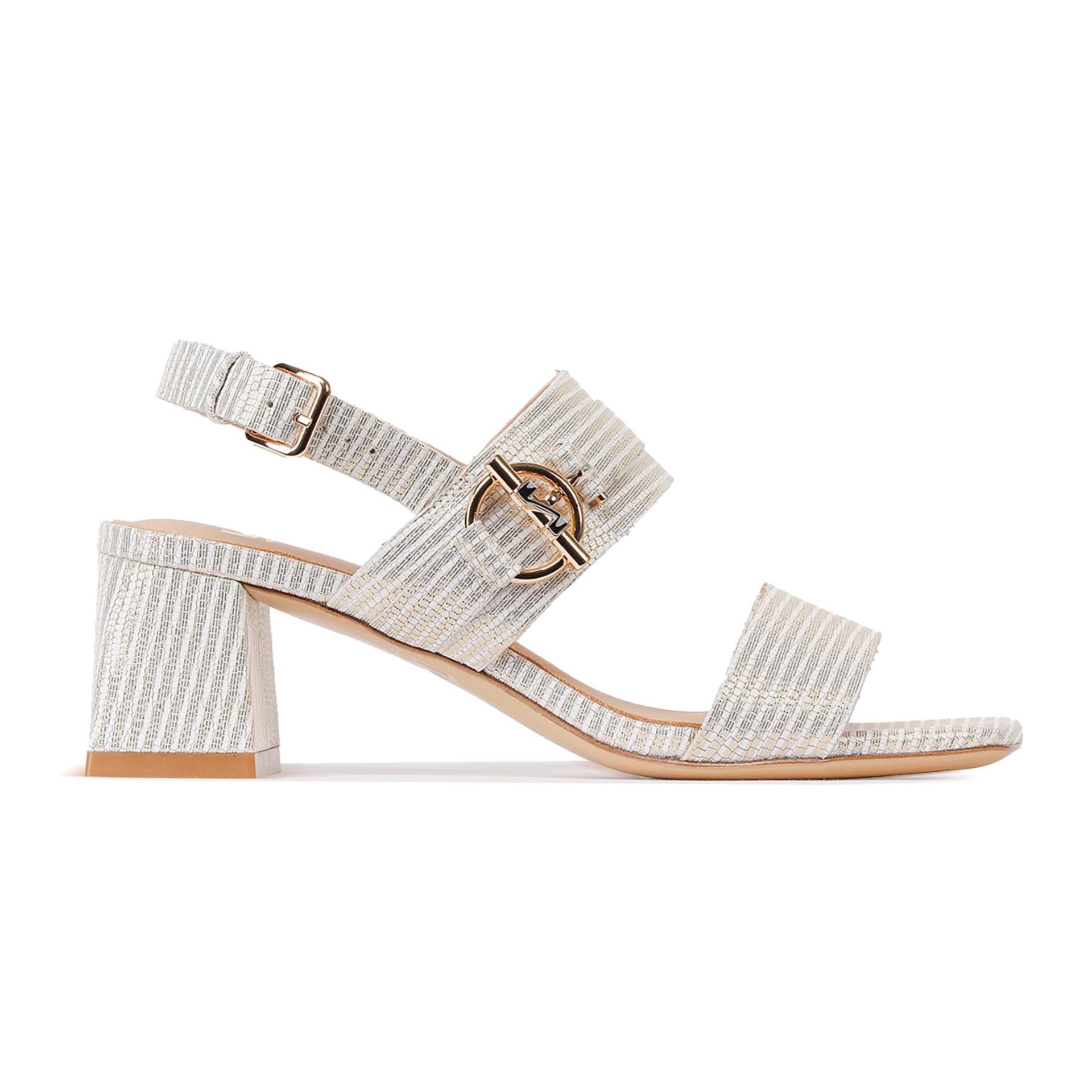 Le talon bloc offre un peu de hauteur supplémentaire sans sacrifier le confort, tandis que la bride de cheville réglable avec boucle dorée apporte une note luxueuse. Ce mélange de style et d’aisance fait de cette sandale un choix parfait en toute occasion, du cocktail à la journée d’été au bureau.
