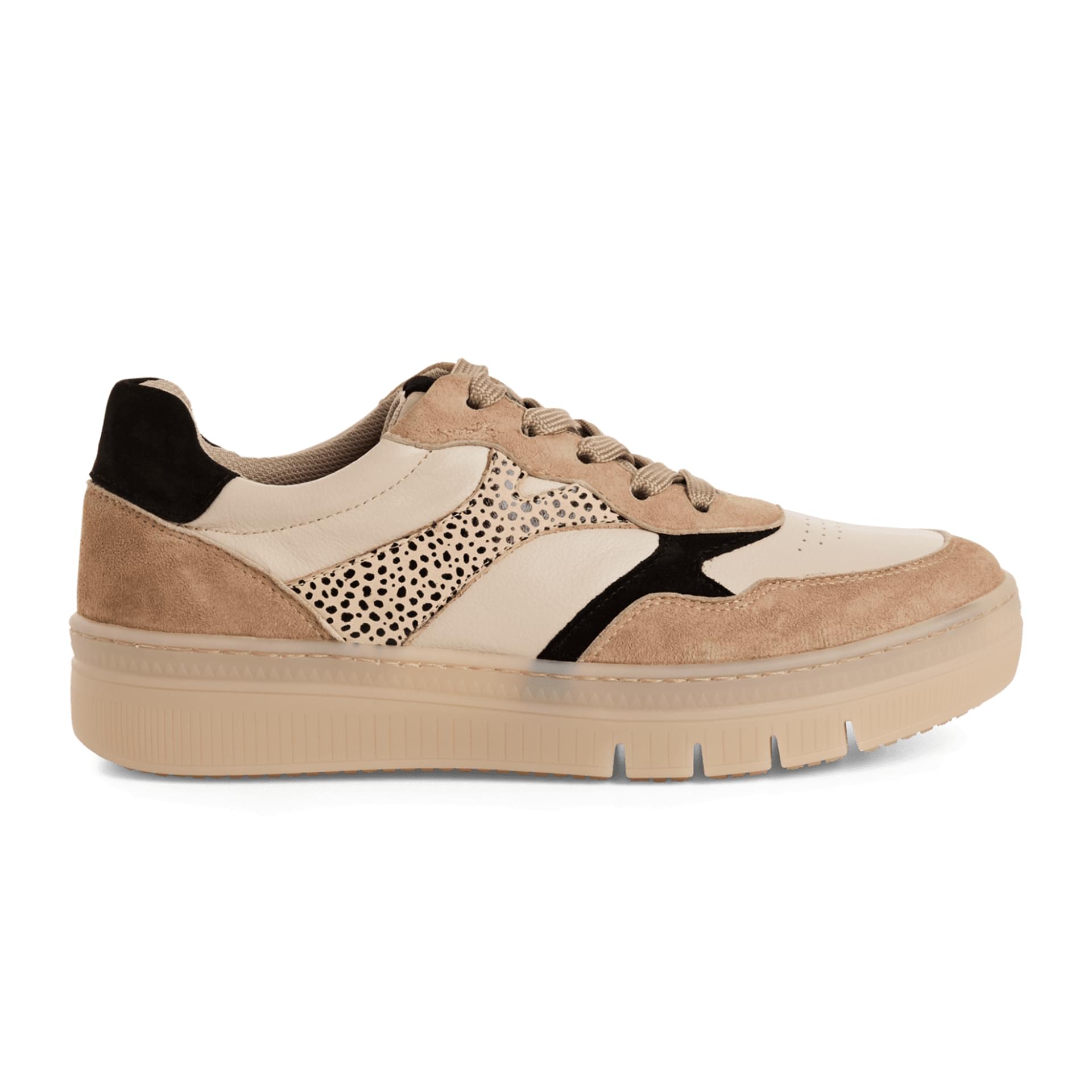beige. L’association de cuir, de suède et de textile, ainsi que le détail