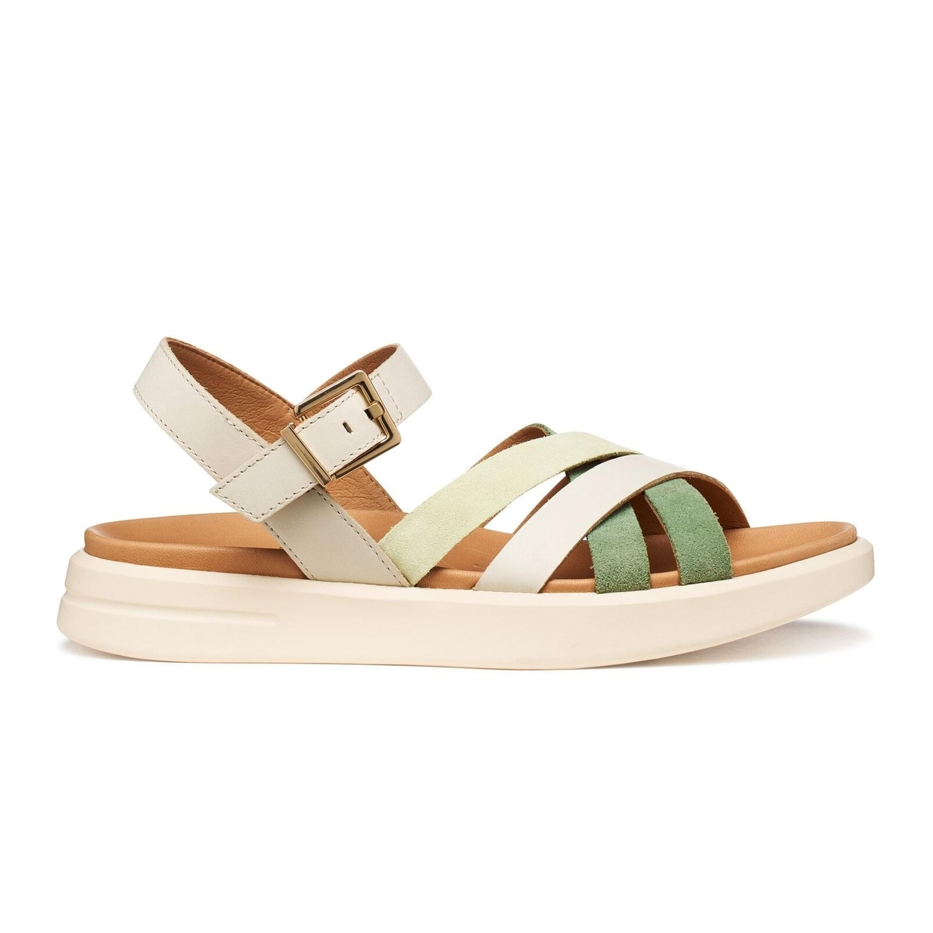 sandalen. De combinatie van licht zandkleur en olijfgroen zorgt voor een frisse,